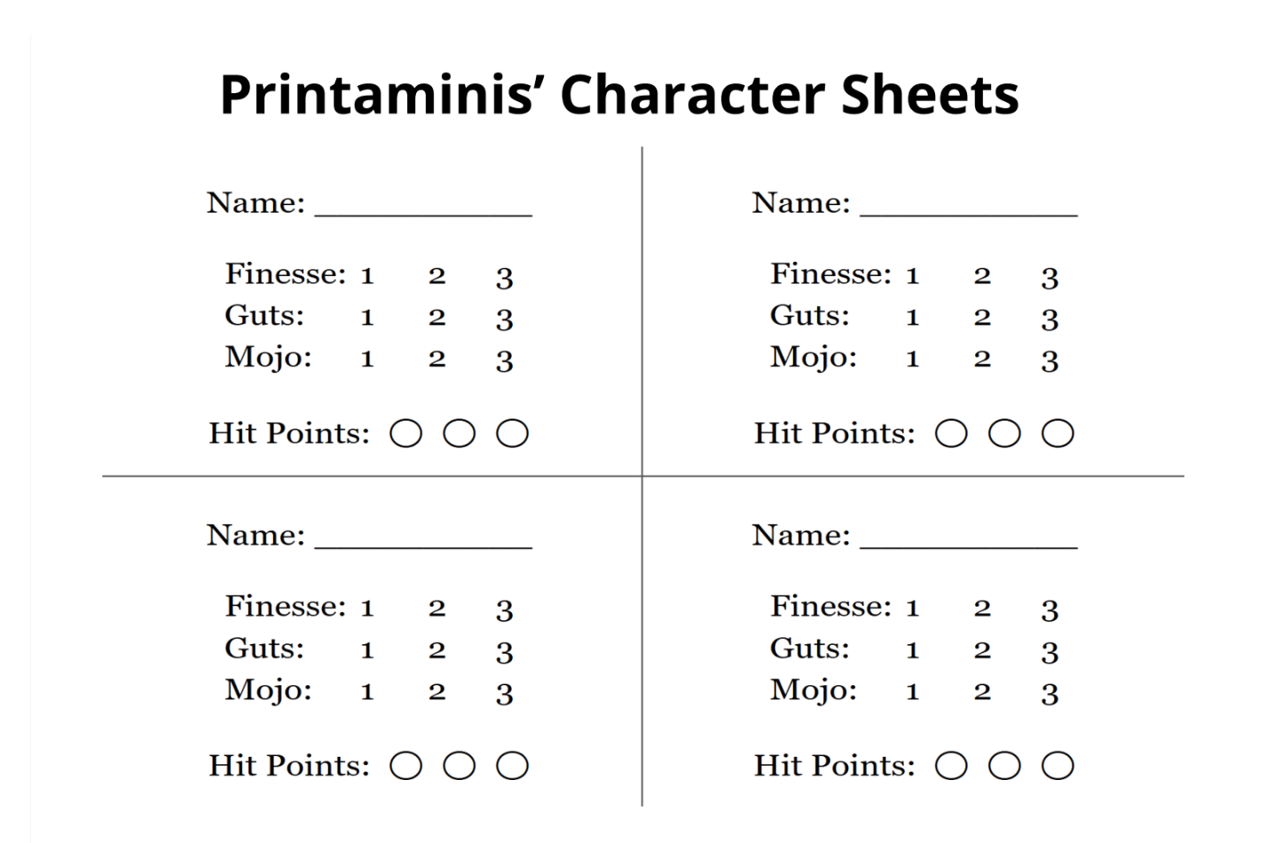 Printaminis: A Tale of Smallfolk is a D6-based tabletop roleplaying game where players juggle a set of three stats and a handful of weapons to take down household items. Unlike most tabletop games, A Tale of Smallfolk is set in real life! The world is your oyster. Players must use their stats to explore the world as a smallfolk, collect weapons that suit them, and make their way over to the object they set out on their adventure for.